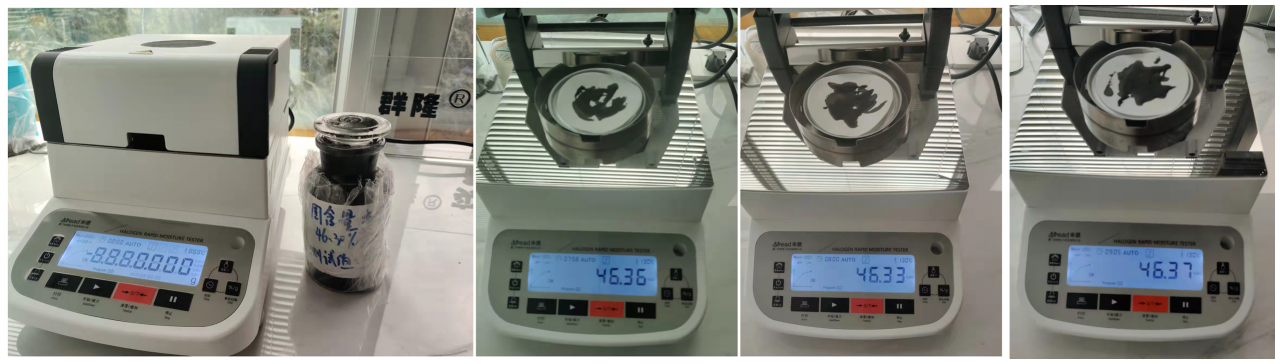 - 復(fù)位儀器,待儀器冷卻至40℃以下后,再取等量的漿料均勻涂在玻璃纖維紙上,重復(fù)上述測試步驟;測試結(jié)束后得出第二組數(shù)據(jù),顯示樣品的固含量為46.33%;第三組數(shù)據(jù),固含量為46.37%;根據(jù)客戶提供的參考數(shù)據(jù)46.30%,實際測試誤差小于客戶給出的誤差±0.5%,表示測試結(jié)果可靠,可重復(fù)性好。